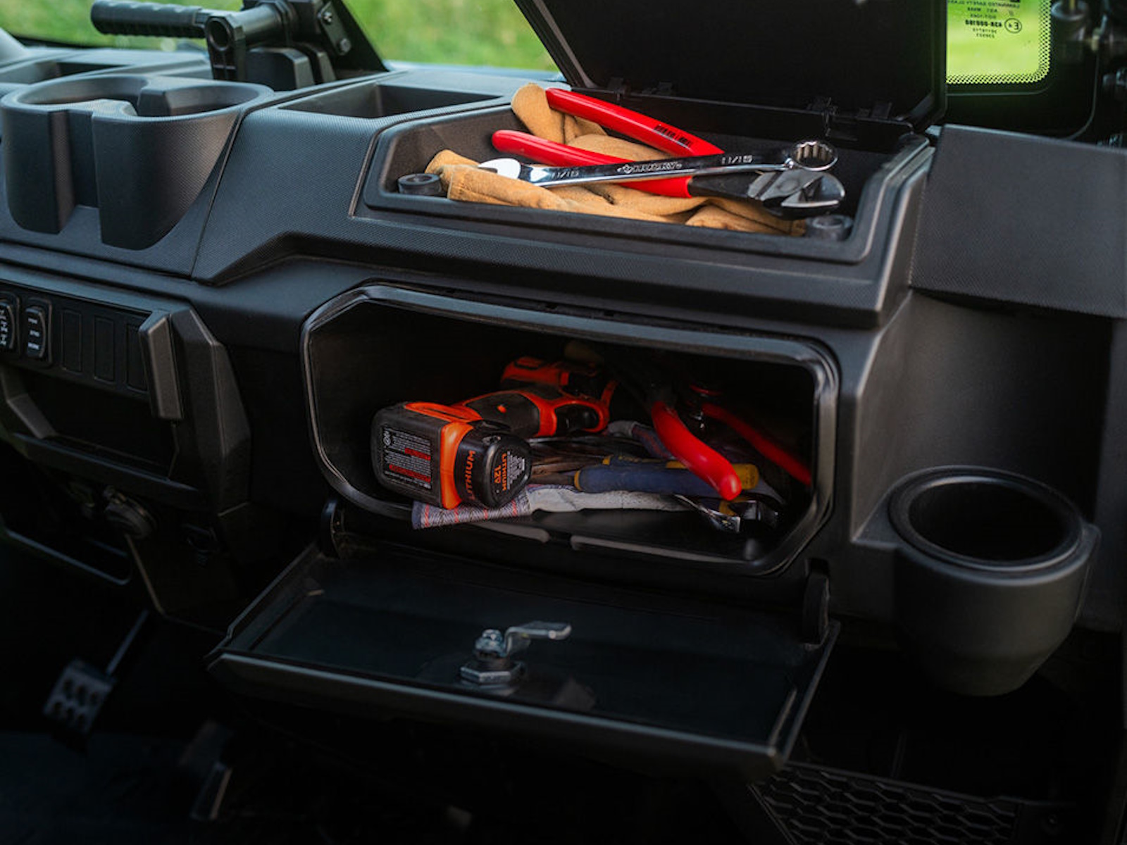Take advantage of easy-to-access, in-cab and underseat storage for your gear. Place essentials in the dual-integrated glove boxes and keep beverages secure with up to 8 cup holders. Plus, charge your phone with the USB charging port.