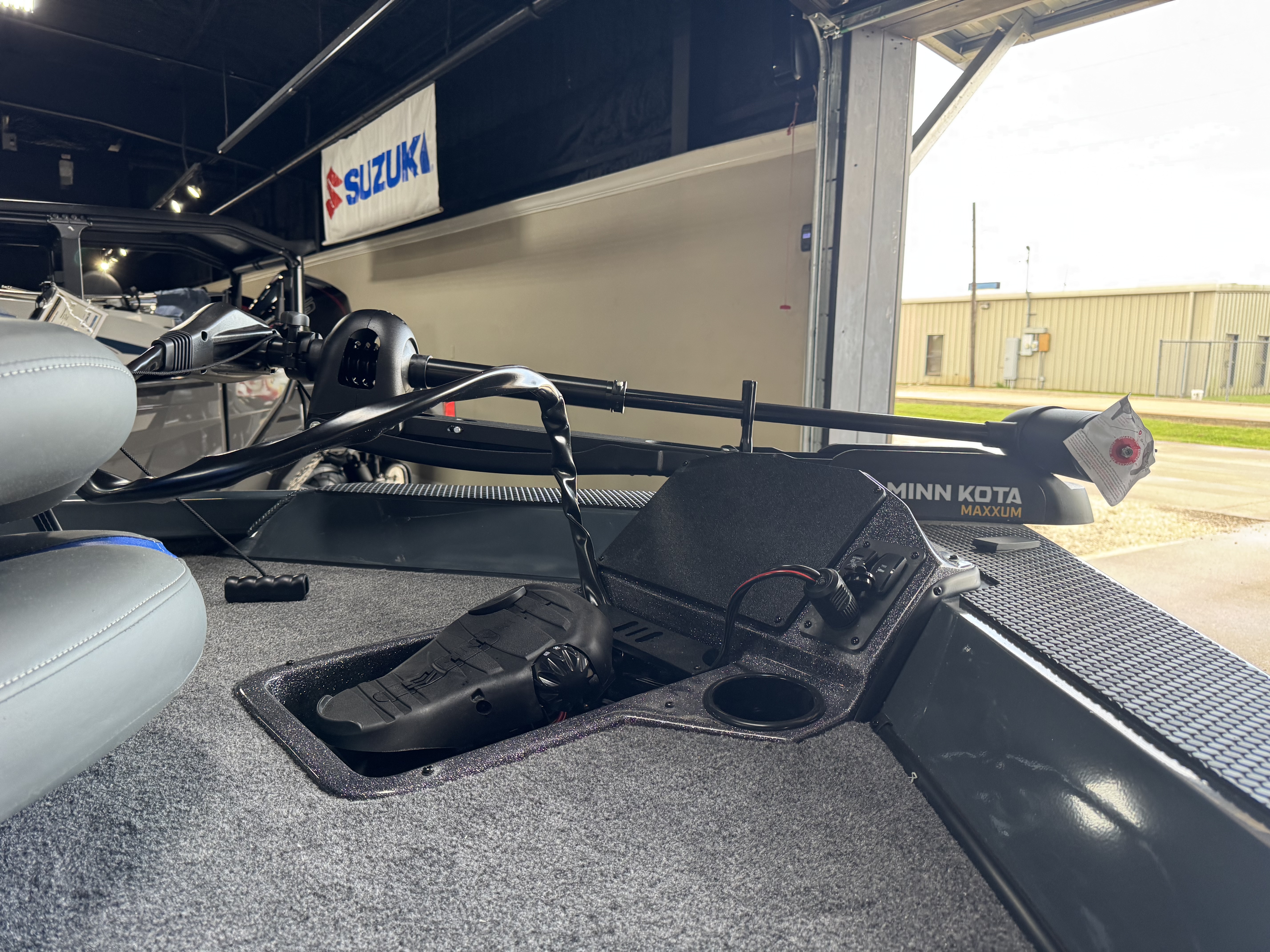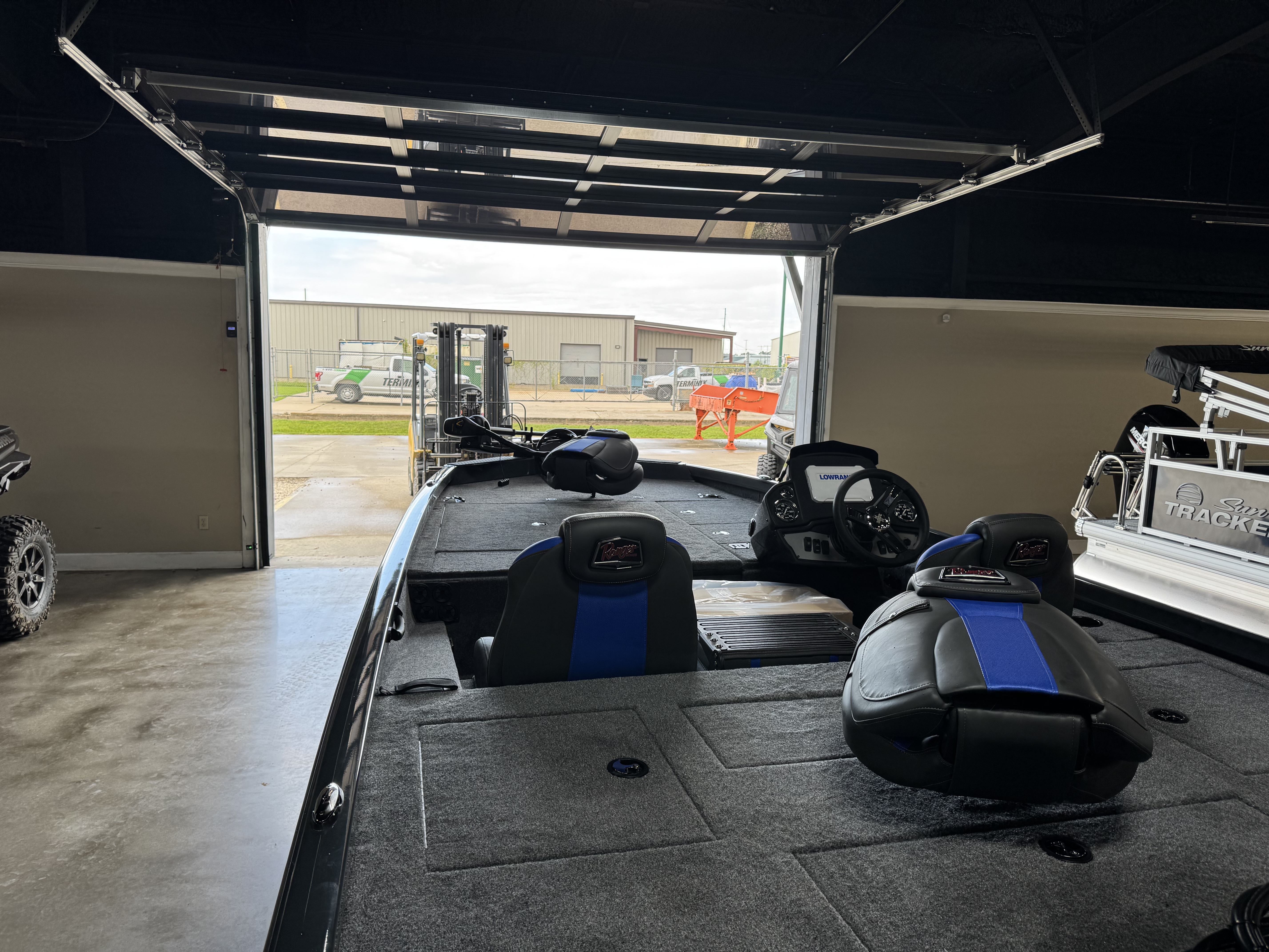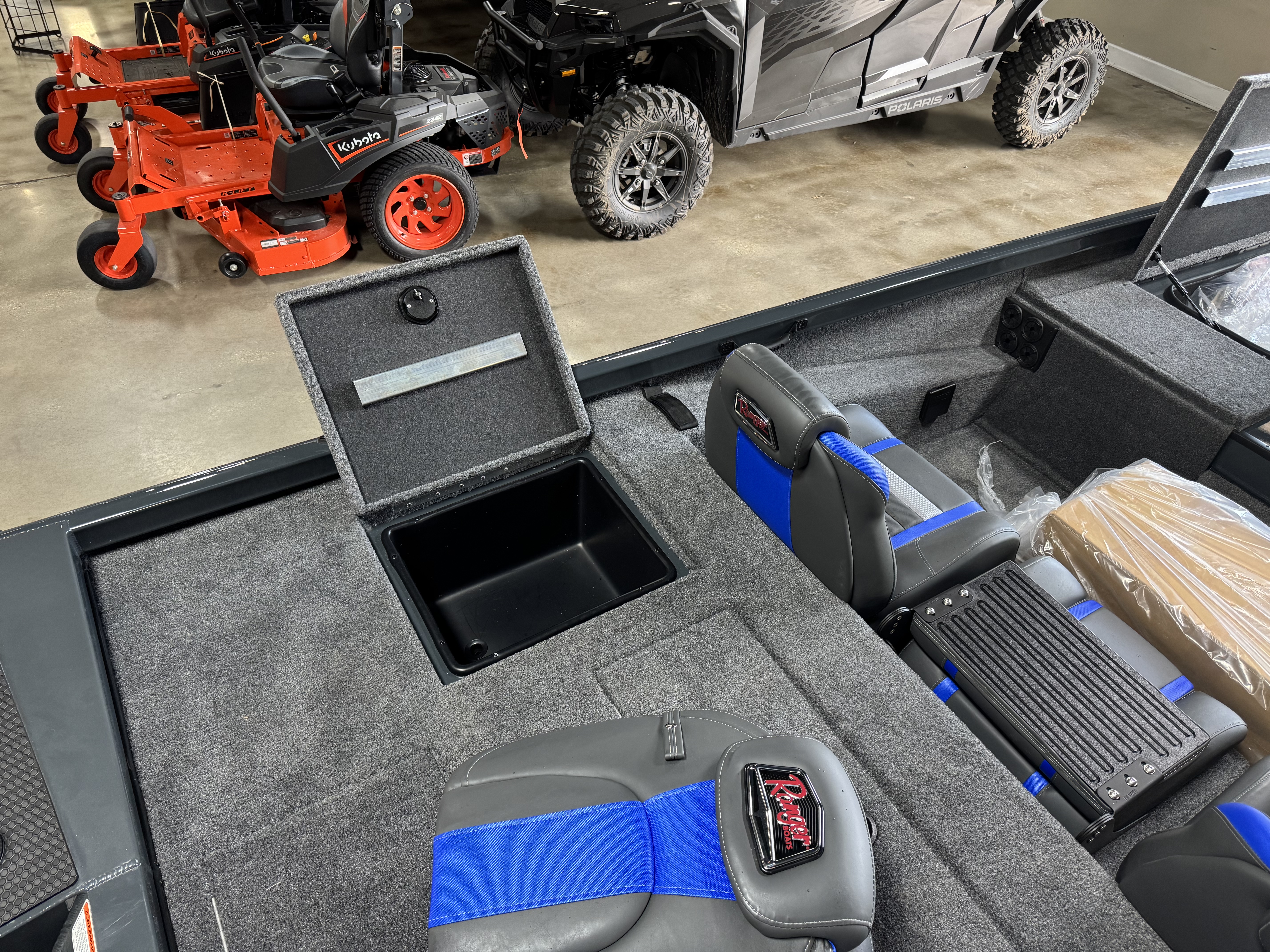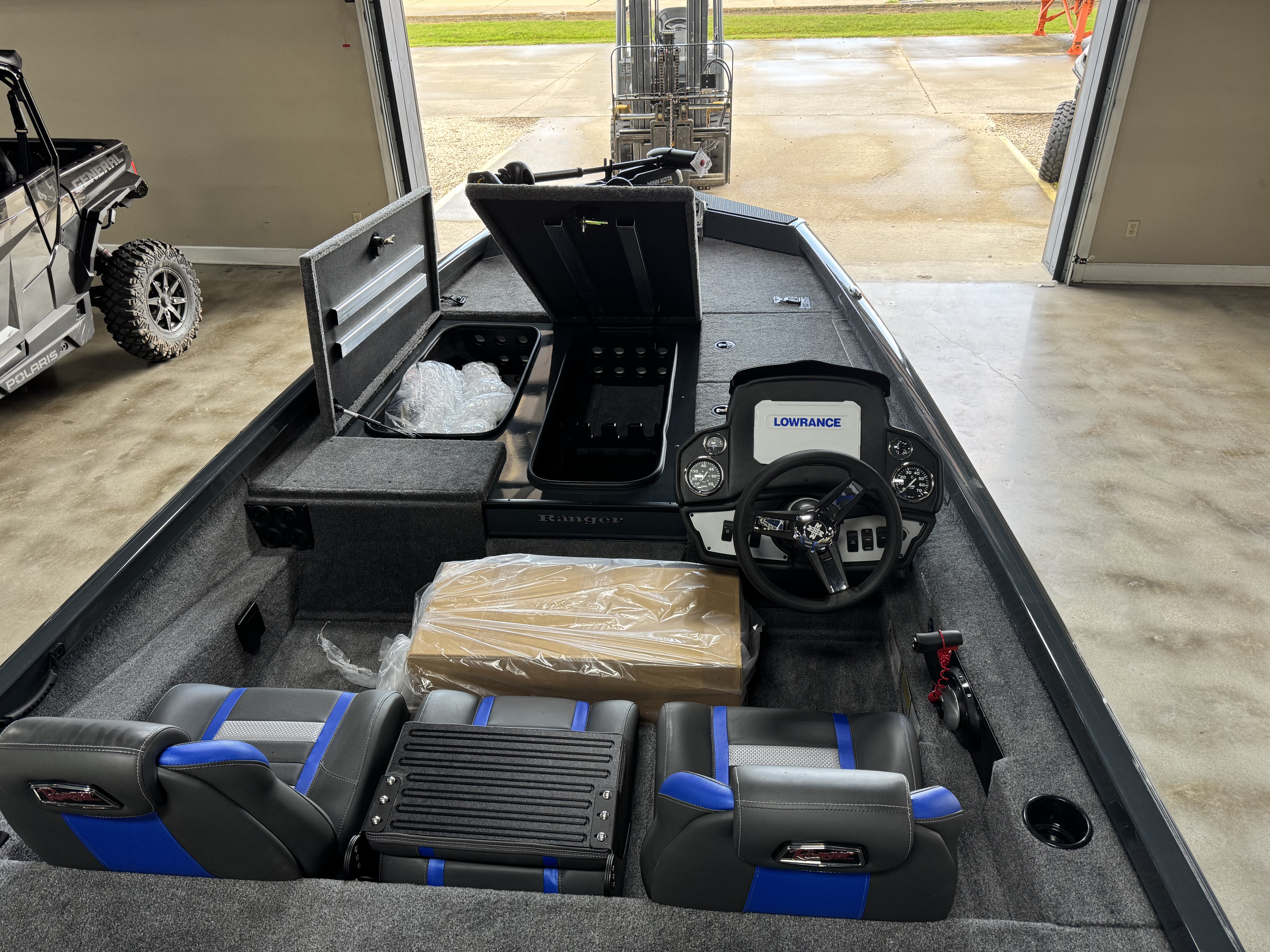 - Custom fitted marine upholstery- driver/passenger bucket seating w/ center fold down & two matching fishing seats