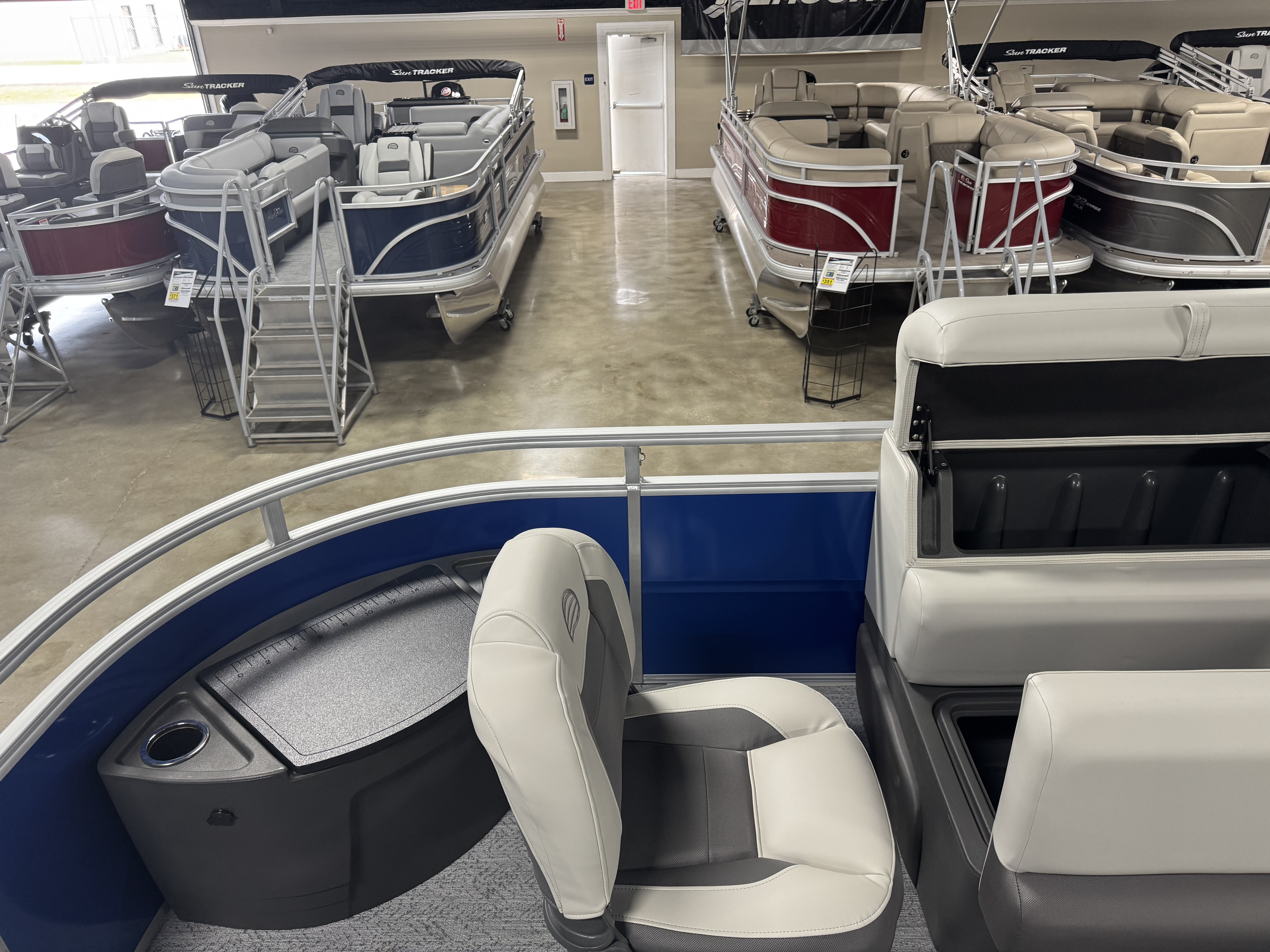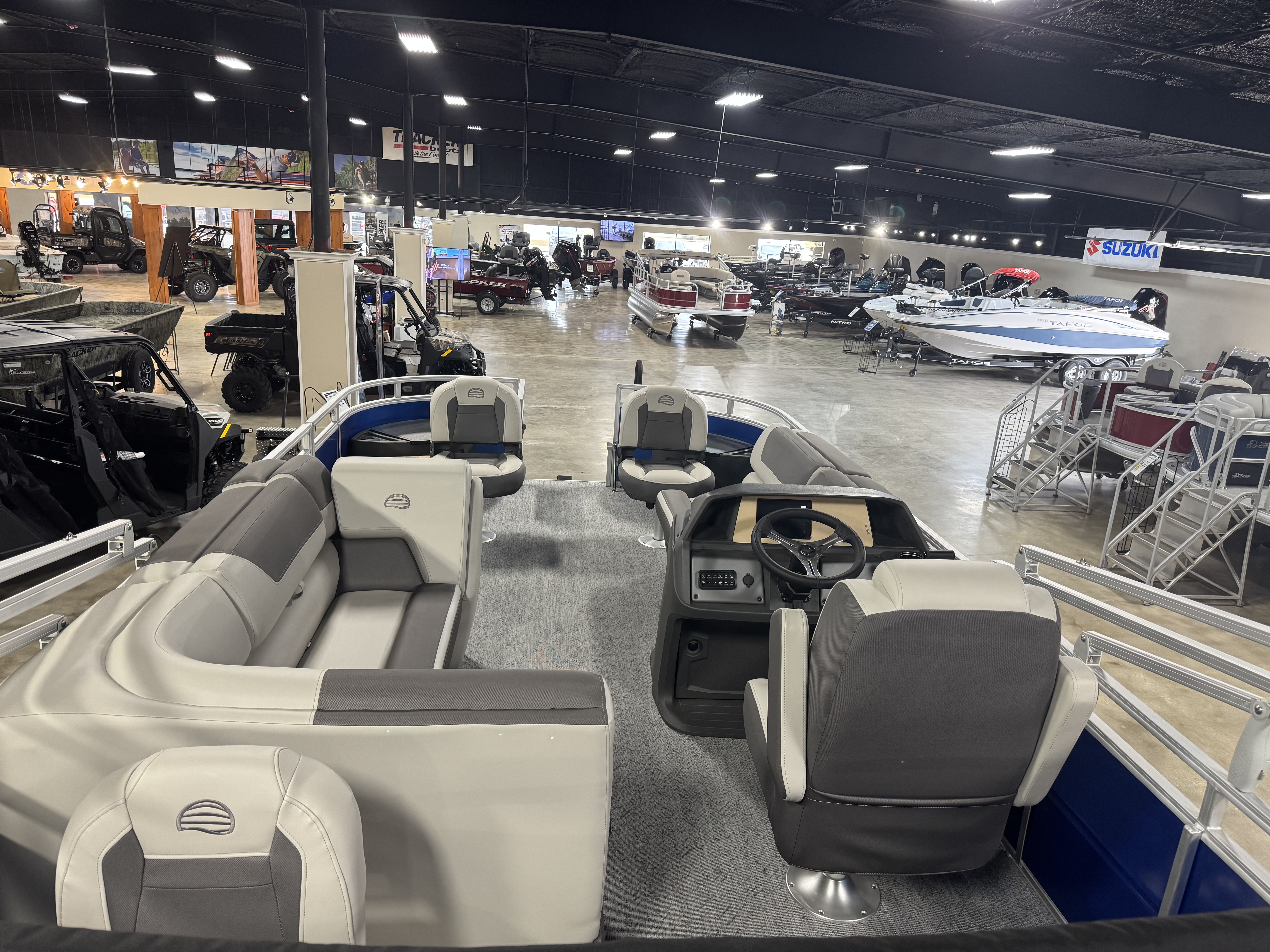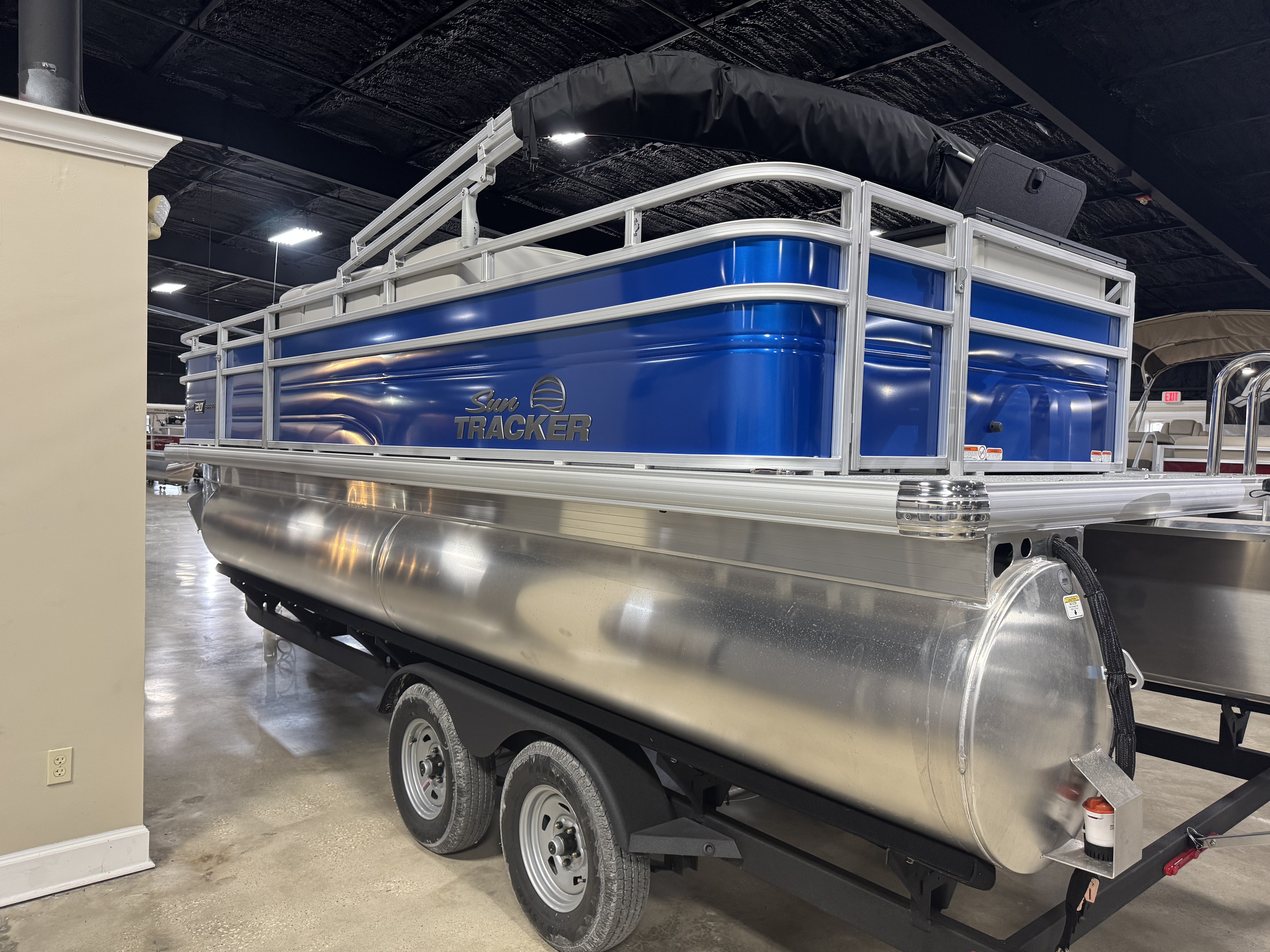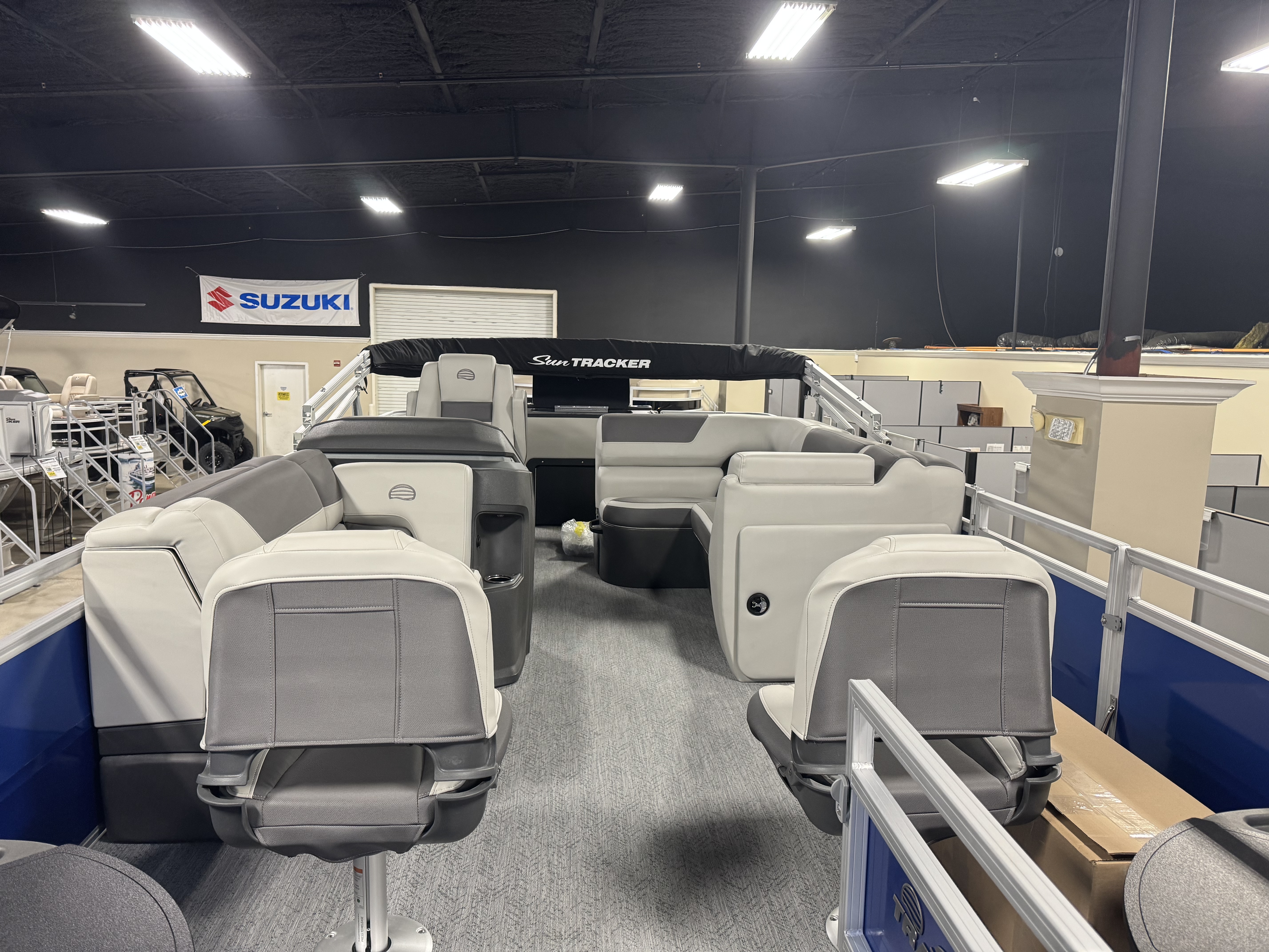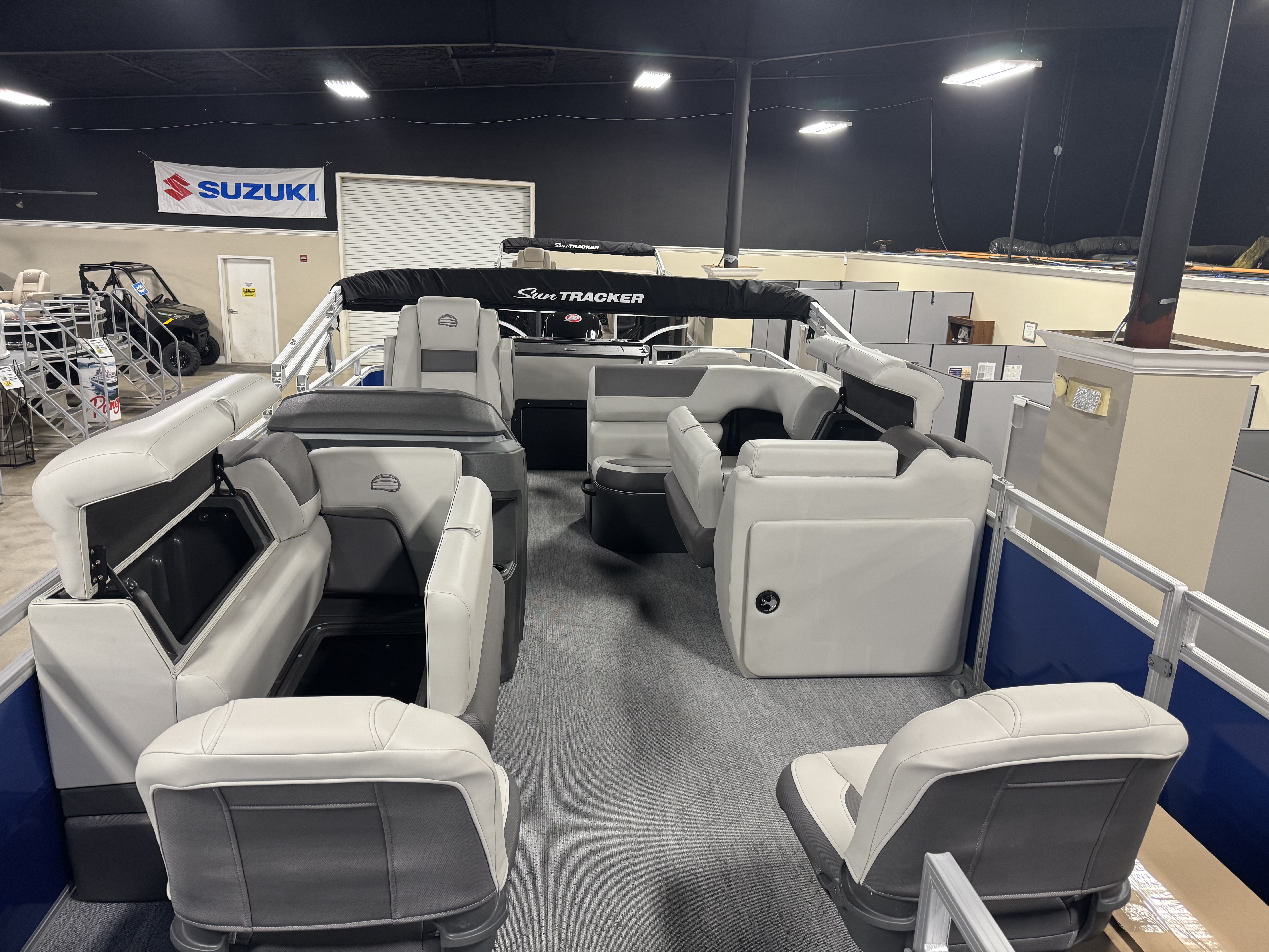 - 9' (2.74 m) SUN TRACKER® QuickLift™ Bimini top w/LED courtesy lights, storage pockets & protective boot (color-coordinated Black w/Charcoal fencing or Sand w/Indigo Blue fencing)