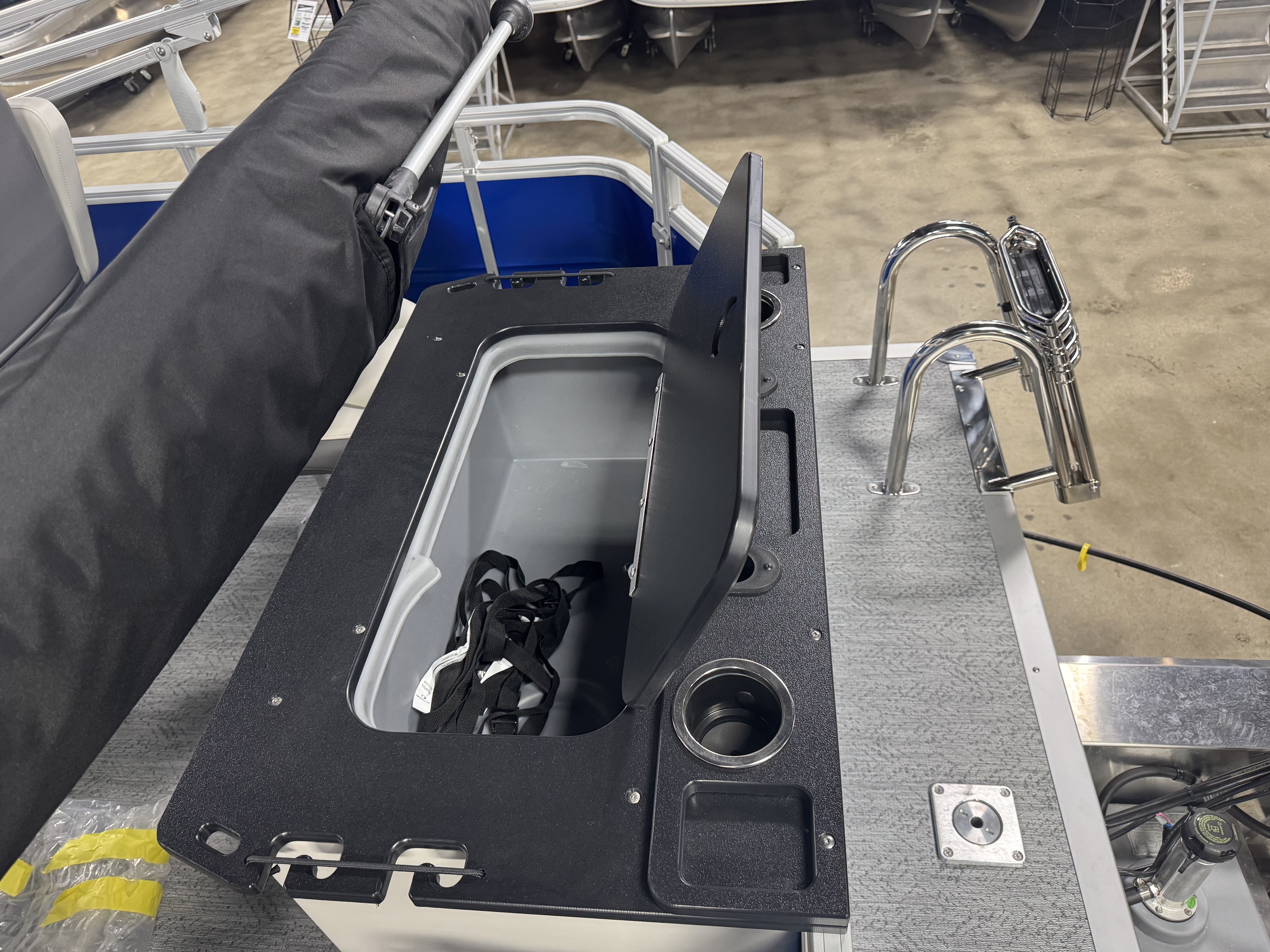 - Front fishing station w/2 pedestal seat bases; rail-mounted rod & tool holders; & bow starboard storage compartment w/rod & drink holders