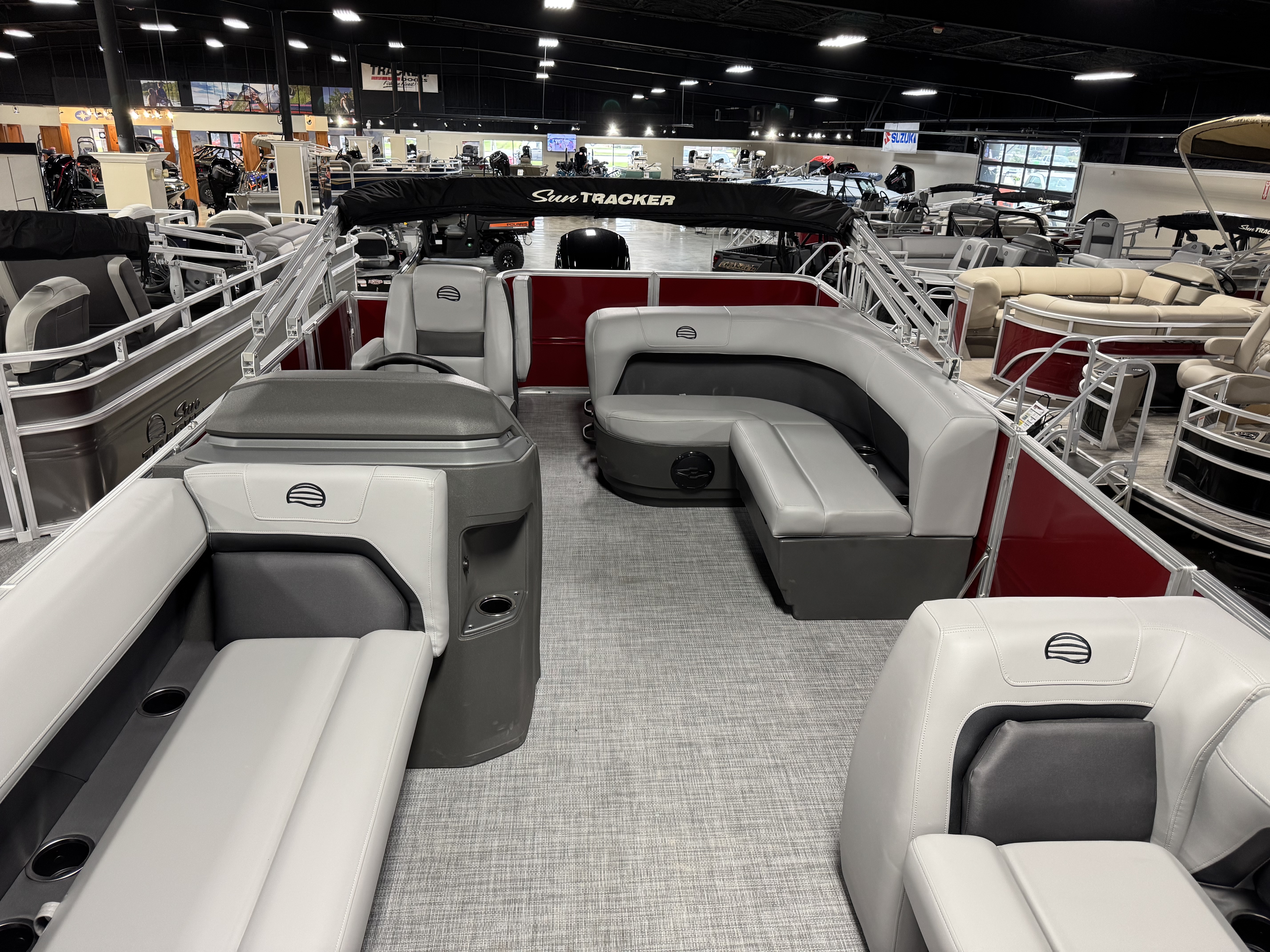 When the sun is high, raise the 9' bimini top for some shade. Create the ideal soundtrack for your adventure with the standard Wet Sounds® stereo and 2 upholstery speakers. The SUN TRACKER FLARE touch-screen gauge display and 12-button switch panel give you ultimate control over your boating experience.