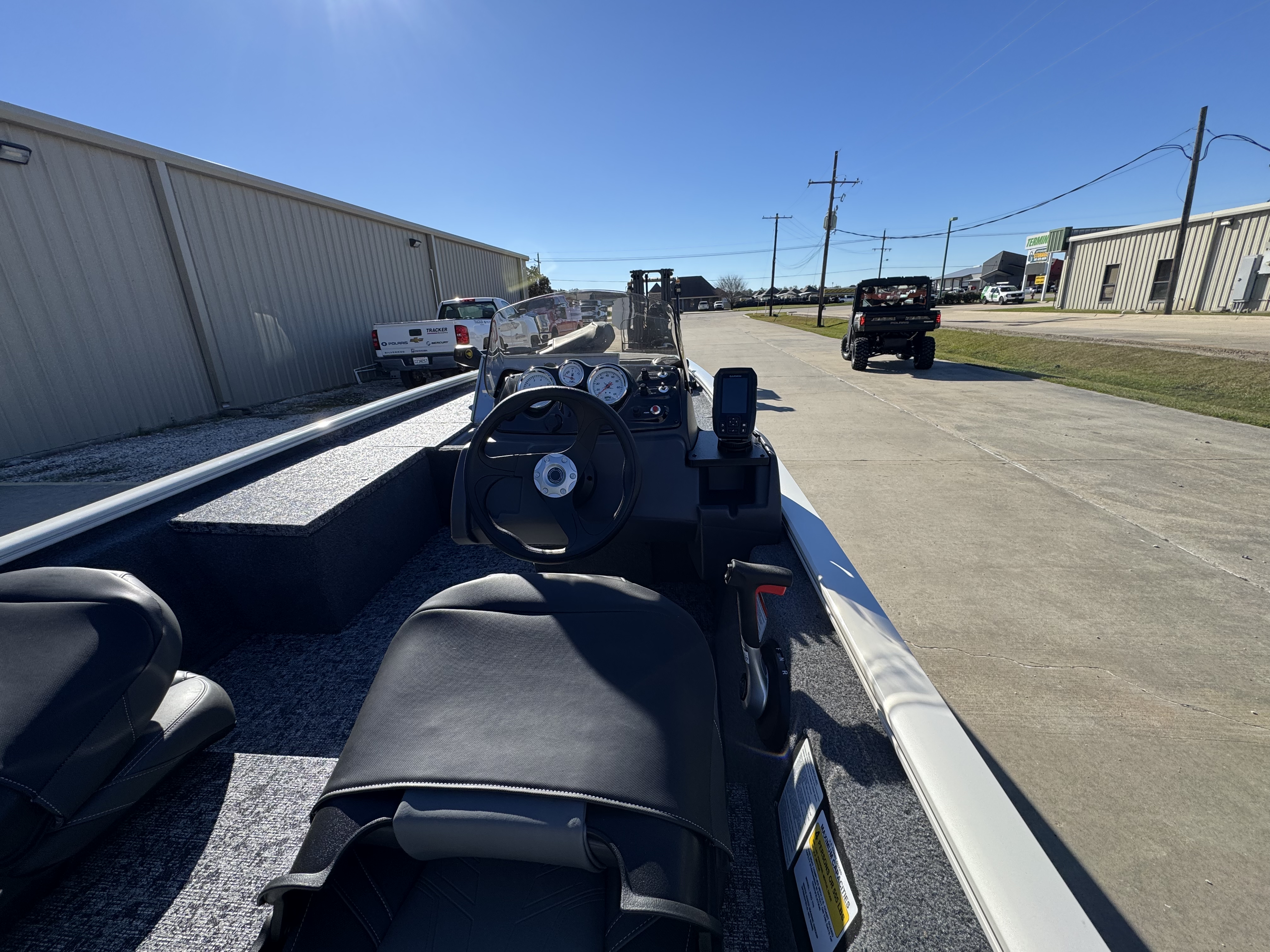 - Sleek, 1-piece rotomolded console w/tinted windscreen, open storage compartment, built-in drink holder & 12V outlet