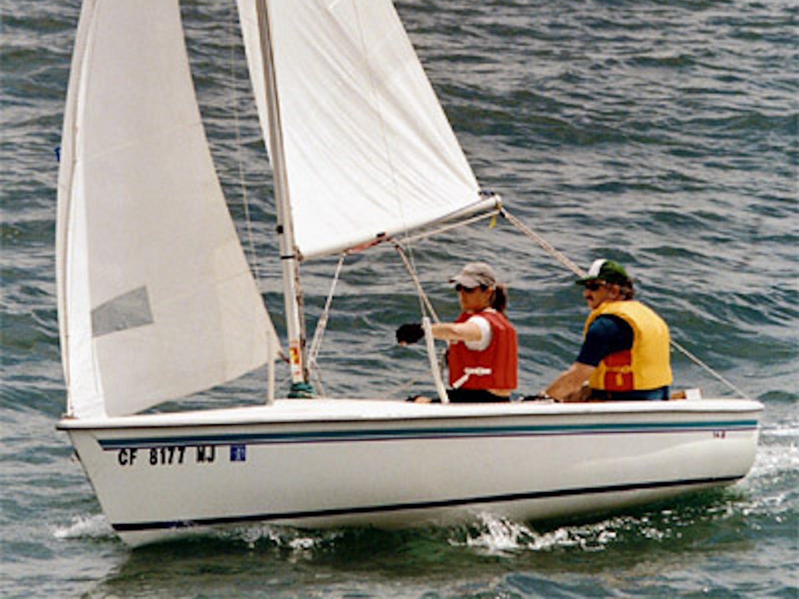 The14.2 is built of hand-laminated fiberglass with molded-in nonskid, anodized aluminum spars, stainless steel rigging and quality hardware.