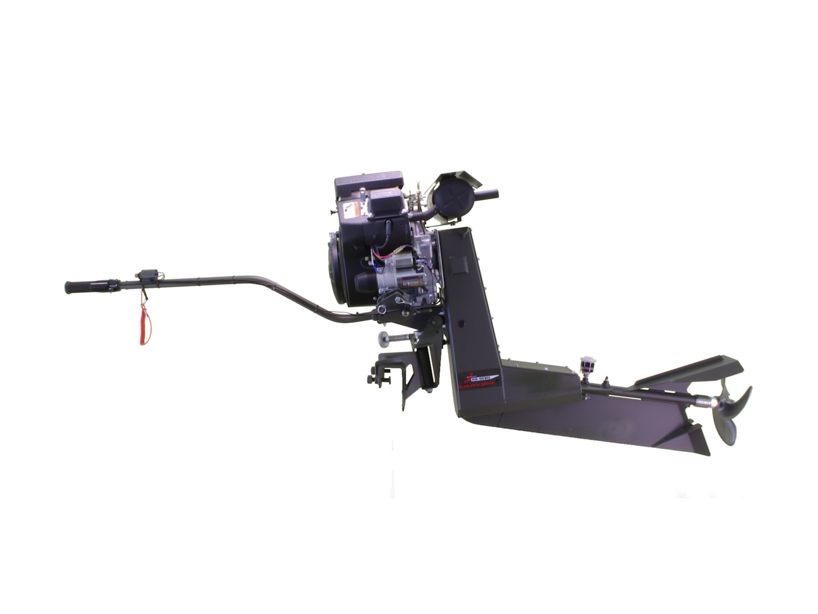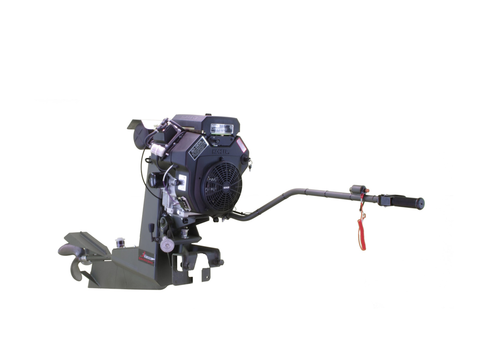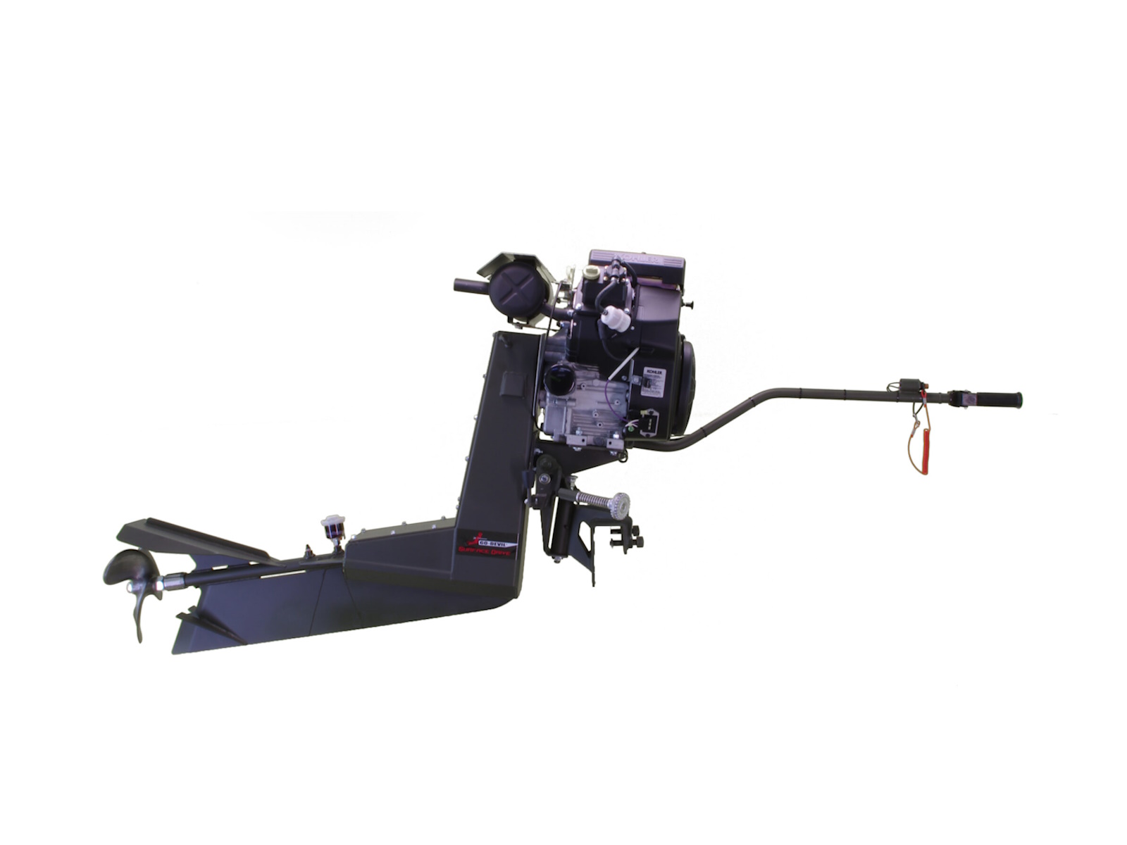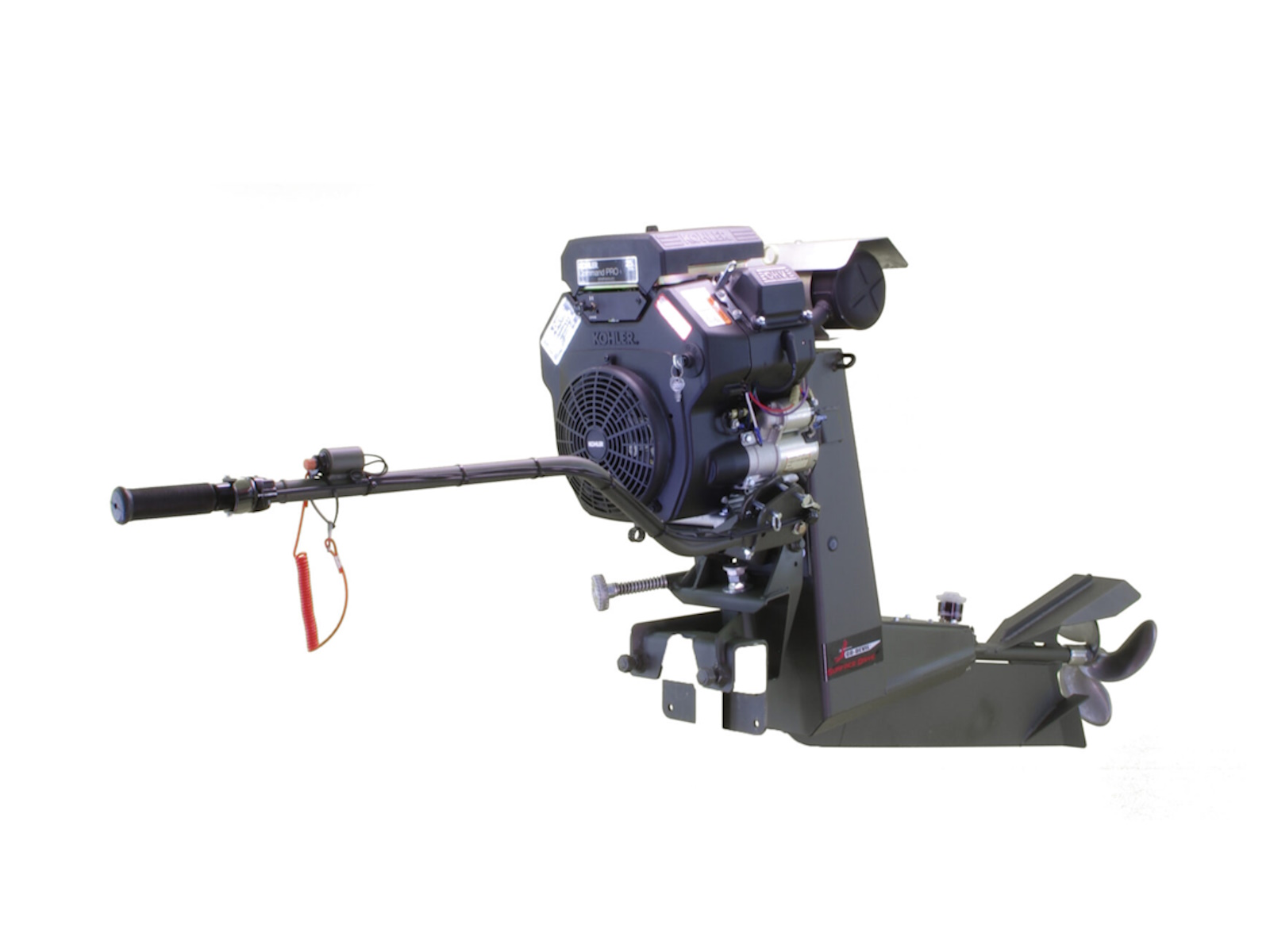 • The 25hp Kohler Surface Drive is an extremely smooth and powerful engine. This engine is the perfect midrange horsepower engine and is well suited for the gamut of boat sizes and loading conditions.  Kohler engines are known for their dependability and durability.  This Surface Drive engine features our longer 36″ drive length for a perfectly balanced frame.