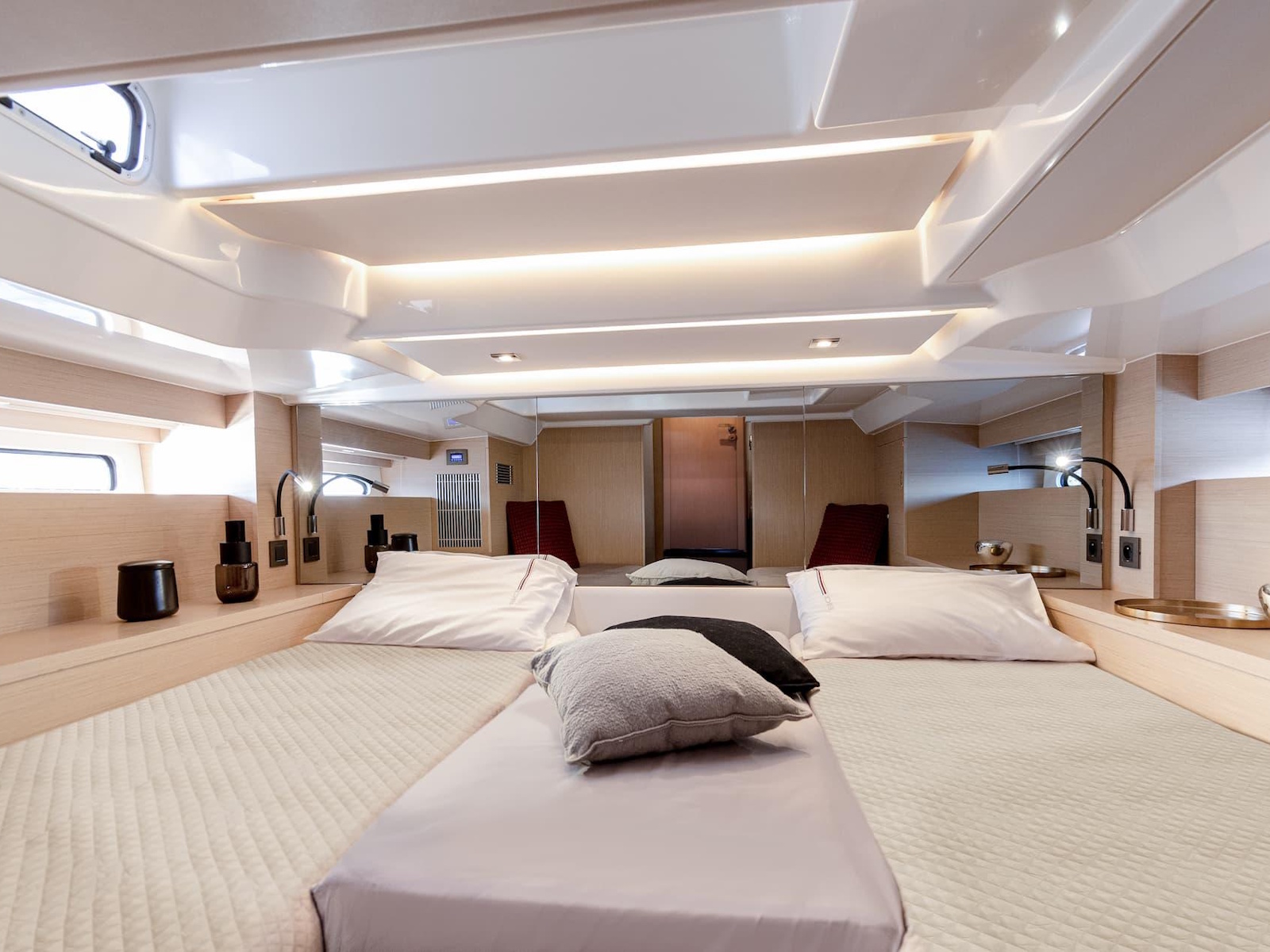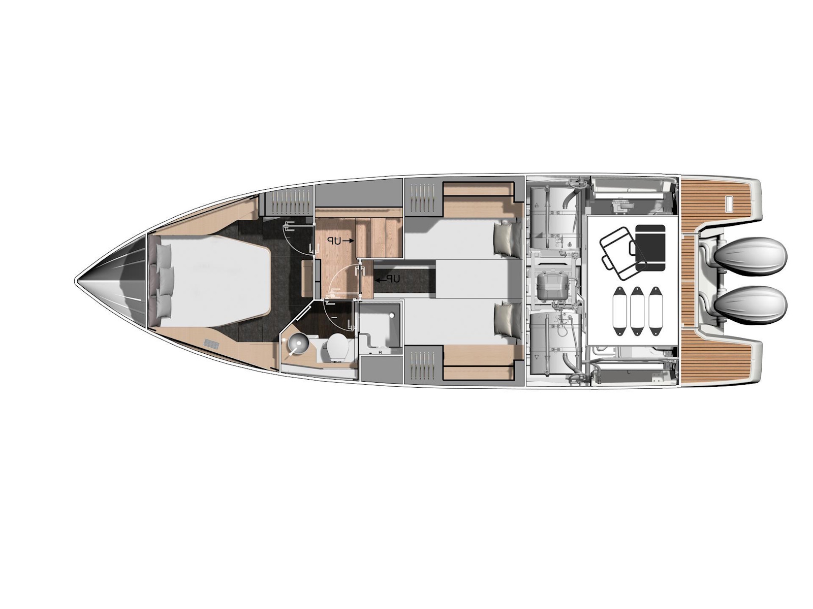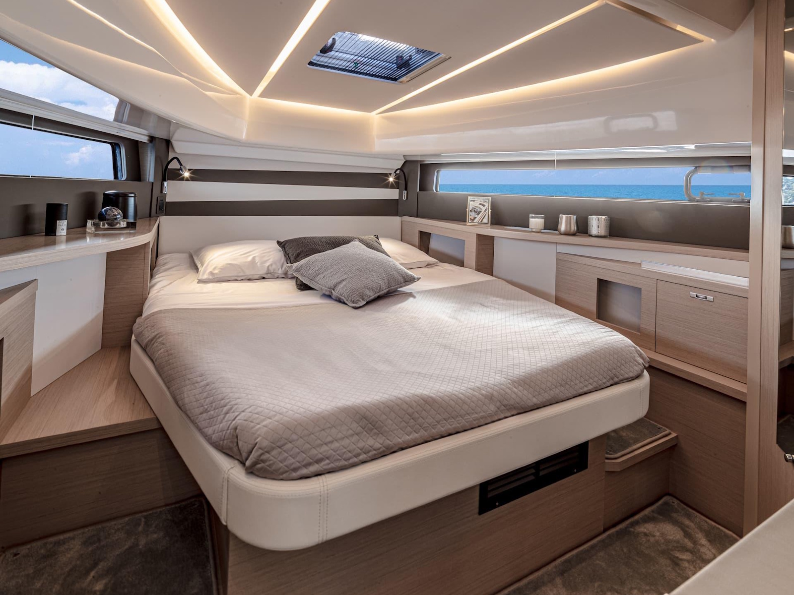 The DB/37 OB offers exceptionally fluid movement on board. At anchor, her side terraces can be deployed for even more space on board. Access to the sea is also facilitated by her vast aft swim platform. Gathered around the cockpit table in the saloon, guests enjoy an uninterrupted field of view, open to the scenery and the horizon. Parties, dinner with friends, or soaking up the warmth of the sun between dives… the choice is yours. But that’s not all: designed for shared pleasures, this day boat invites you to extend your cruise, with her two bright and comfortable, spacious cabins.