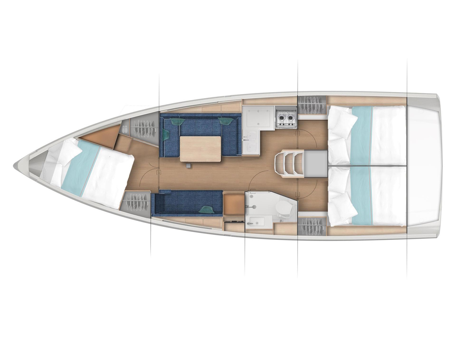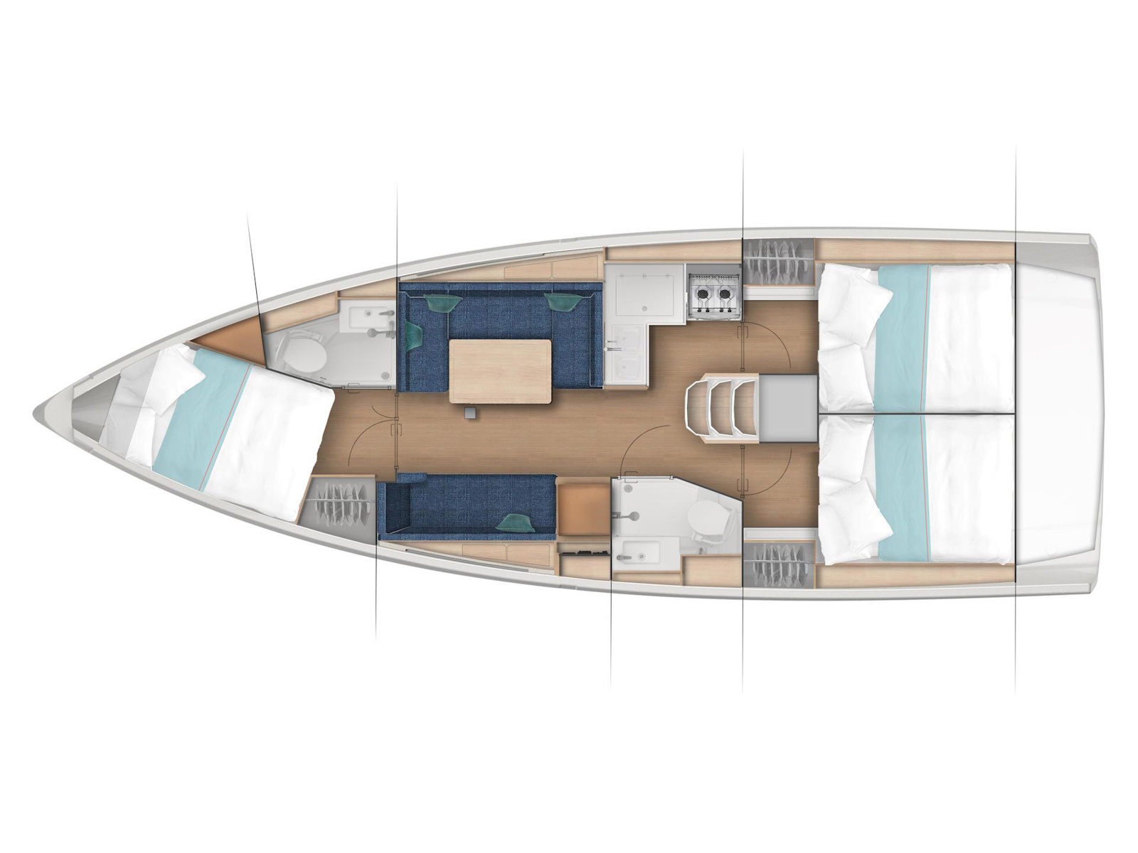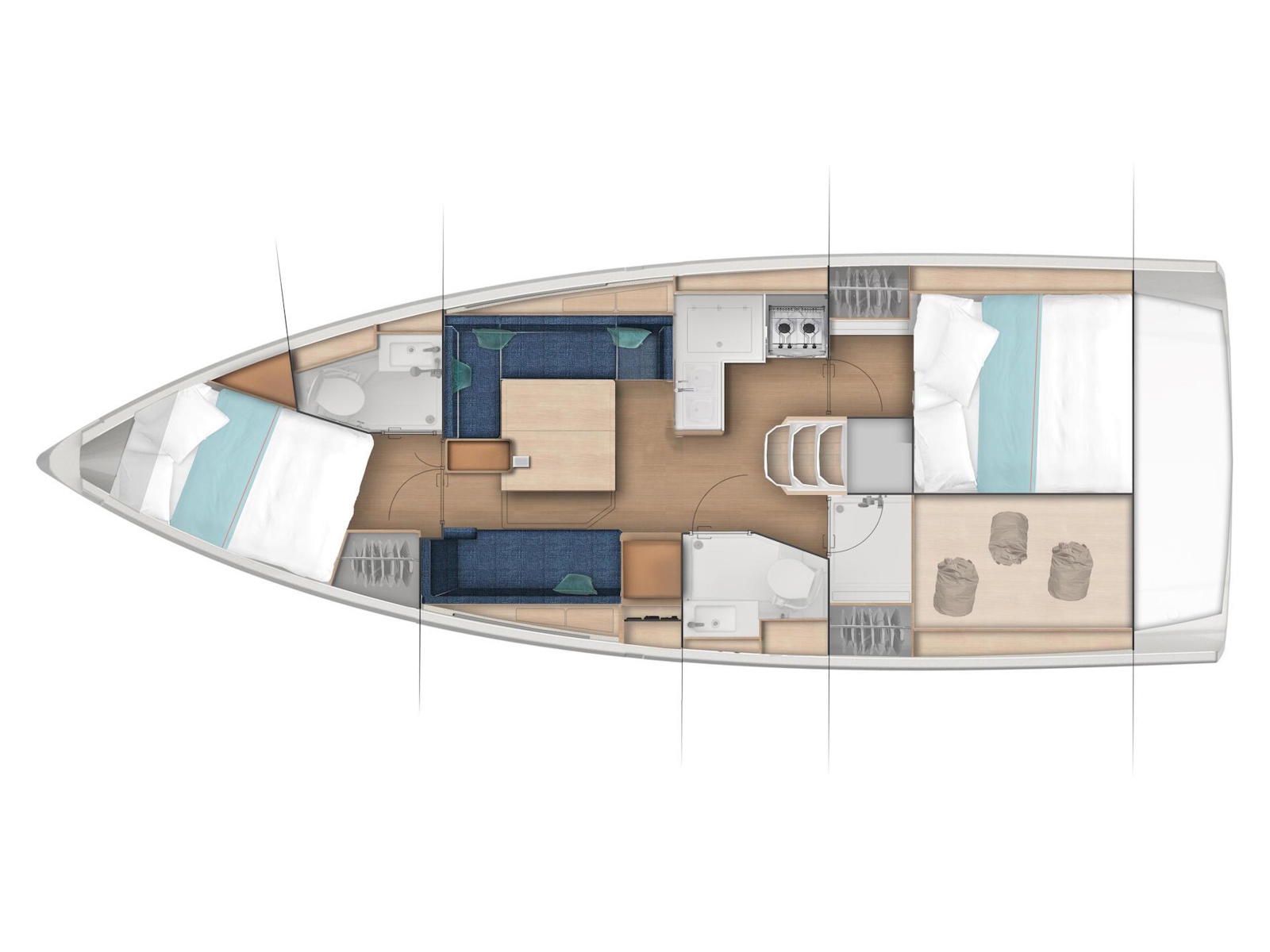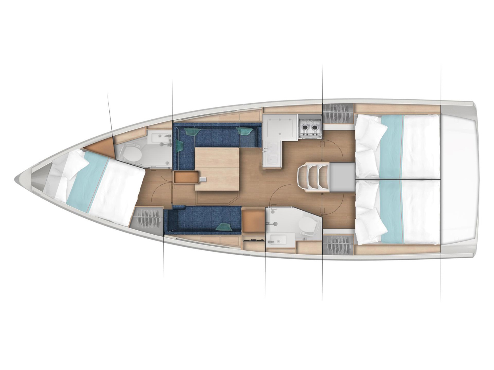 Wherever you look aboard the Sun Odyssey 380, down to the smallest detail, you find a combination of high performance, flow of movement and comfort on board. The inverted bow increases efficiency downwind, responsiveness at the helm, and ease of handling at port. Recessed sidedecks and twin steering wheels provide secure movement about the deck while improving visibility at the helm. The lowered boom facilitates sail access and augments the sail area without weighing down the boat. The lifting keel enables you to dry out on the sides, using removable poles, without impacting performance.