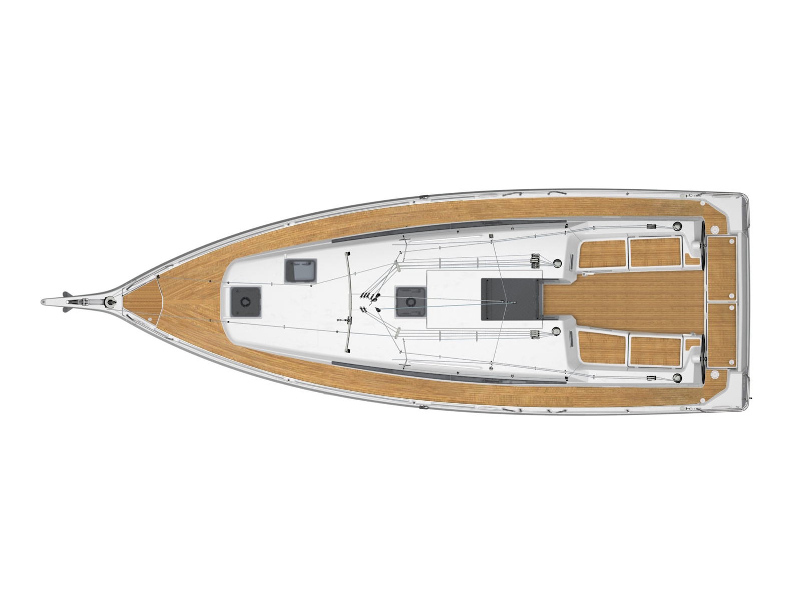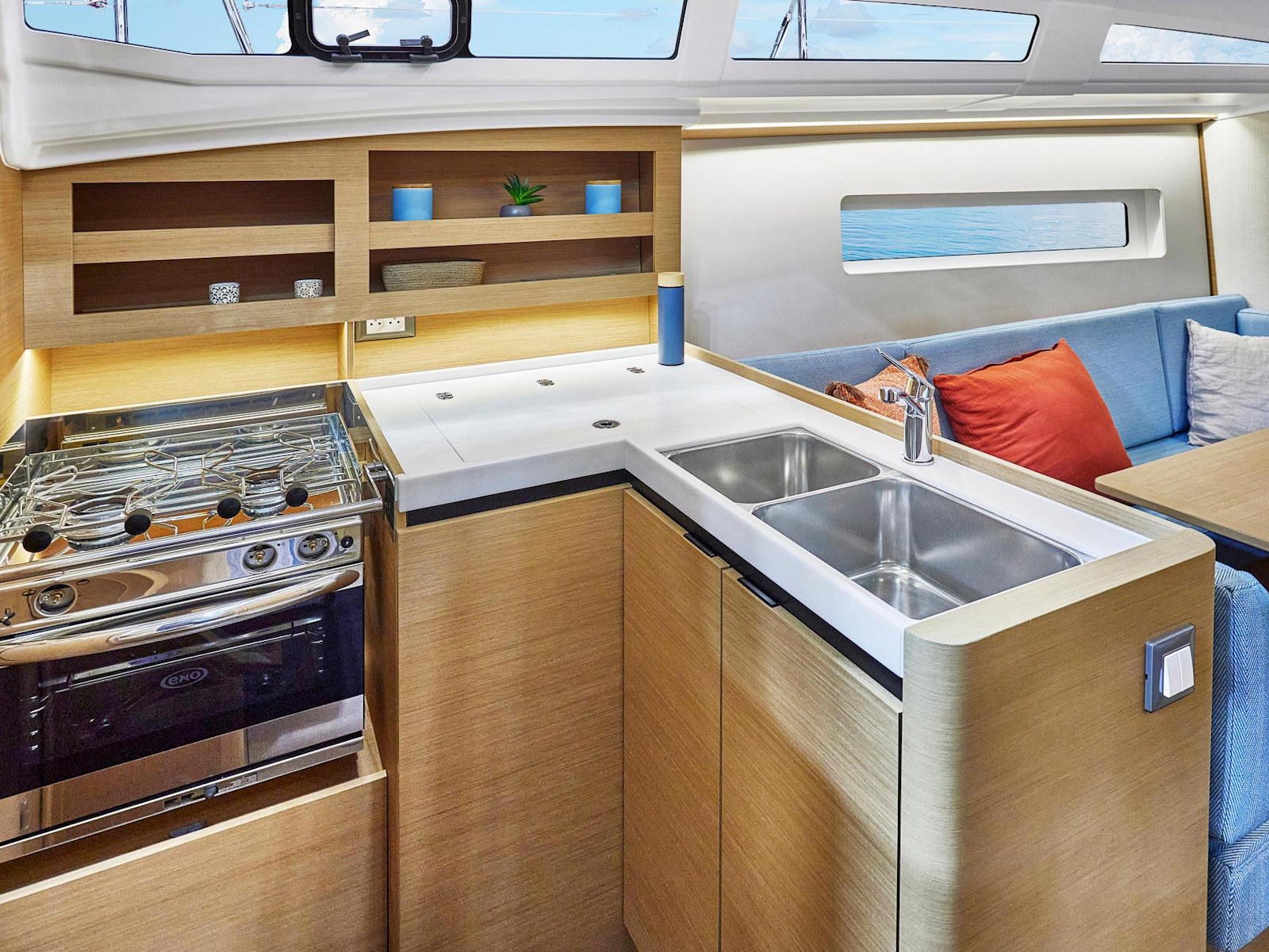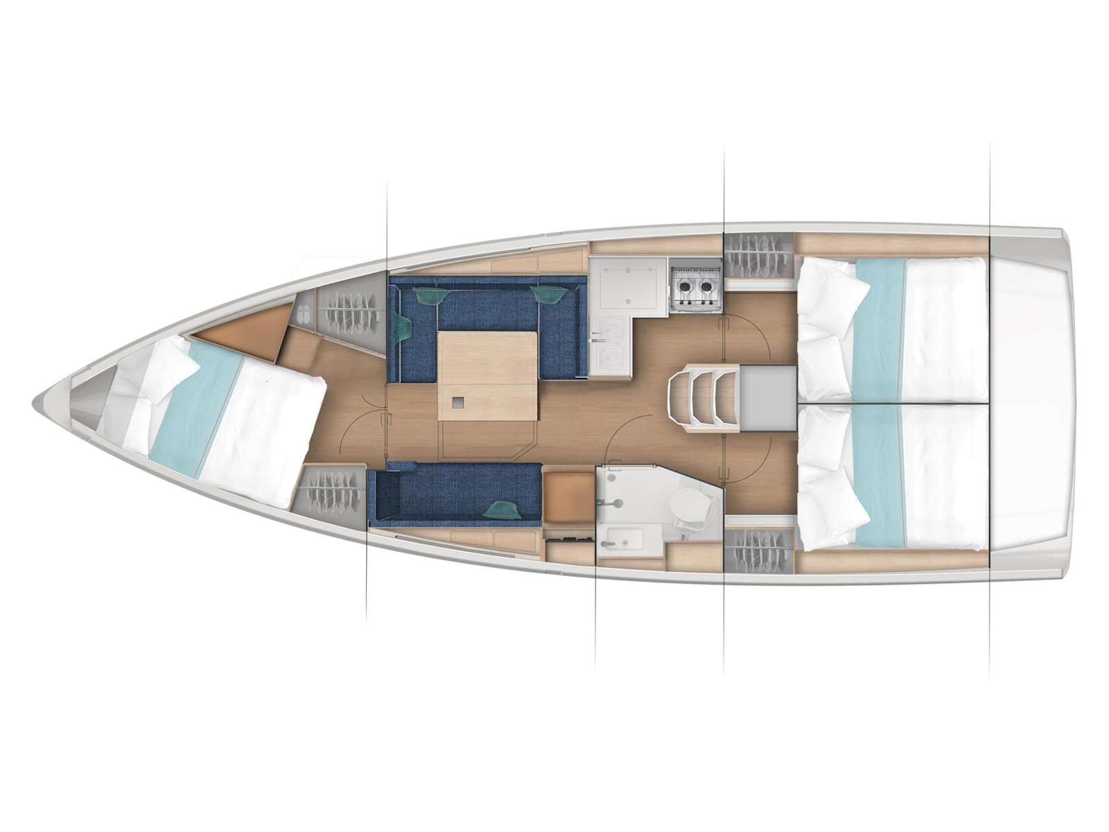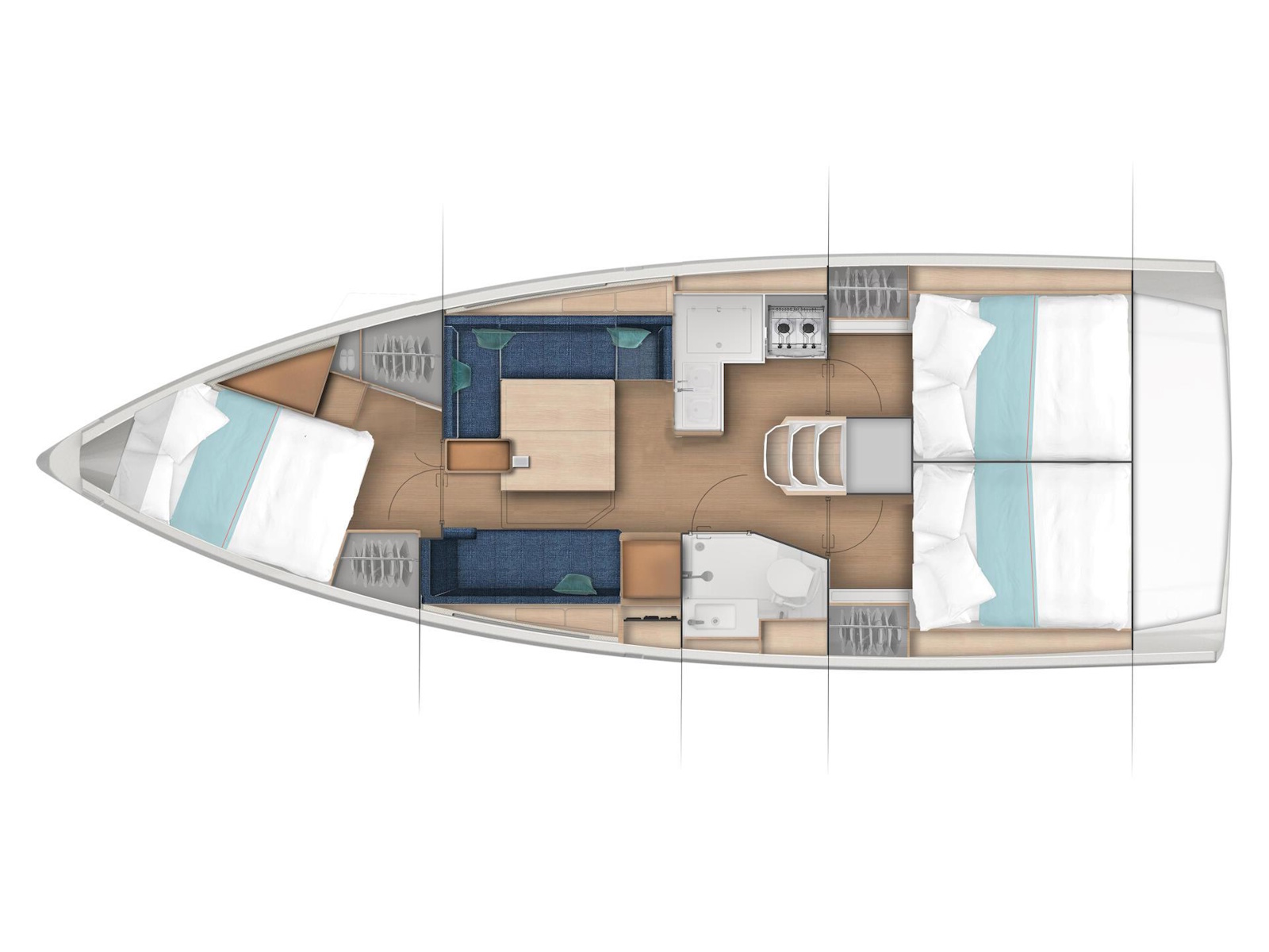 Wherever you look aboard the Sun Odyssey 380, down to the smallest detail, you find a combination of high performance, flow of movement and comfort on board. The inverted bow increases efficiency downwind, responsiveness at the helm, and ease of handling at port. Recessed sidedecks and twin steering wheels provide secure movement about the deck while improving visibility at the helm. The lowered boom facilitates sail access and augments the sail area without weighing down the boat. The lifting keel enables you to dry out on the sides, using removable poles, without impacting performance.