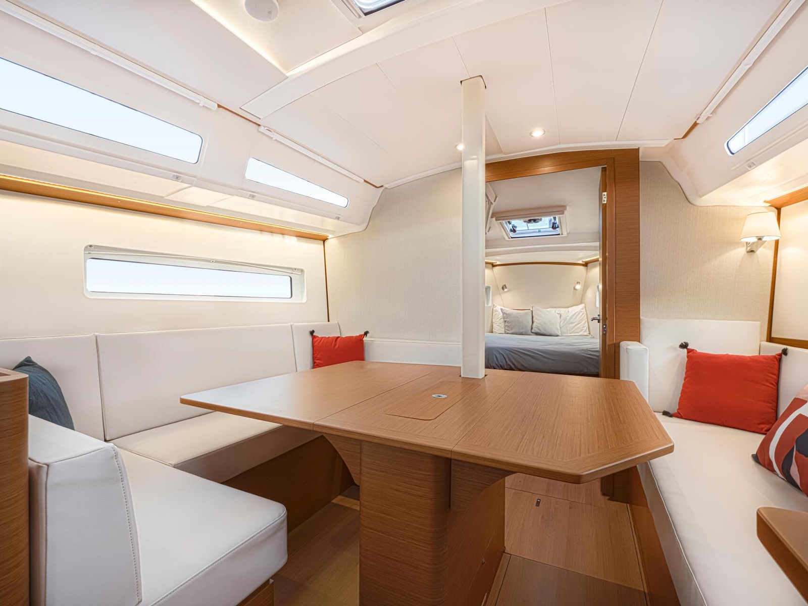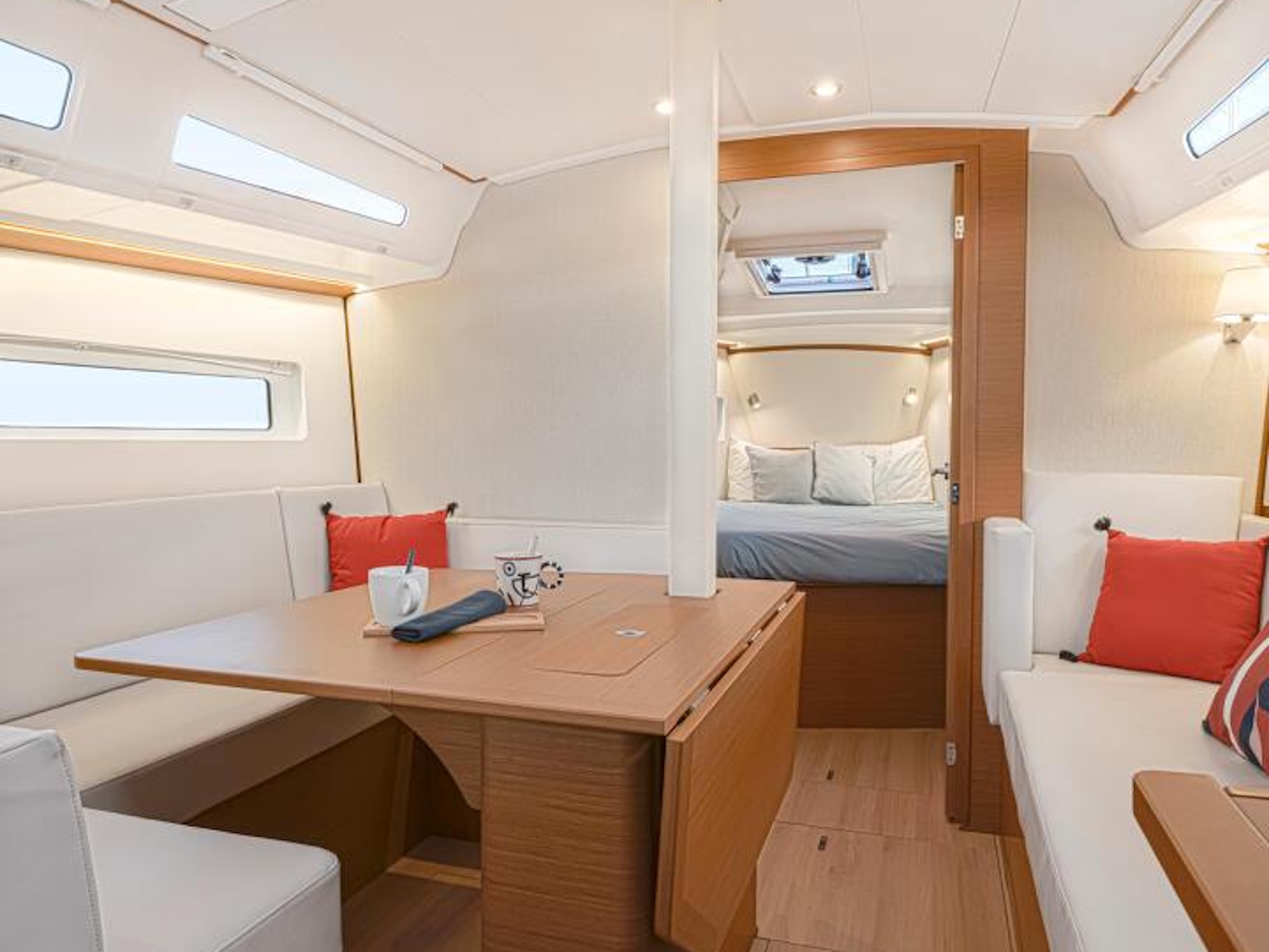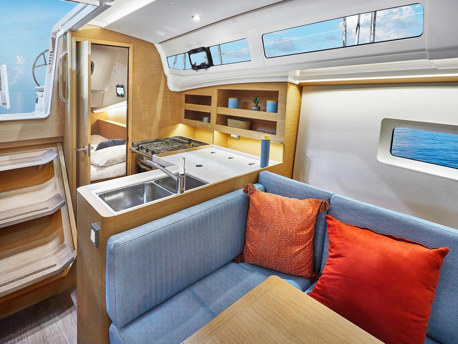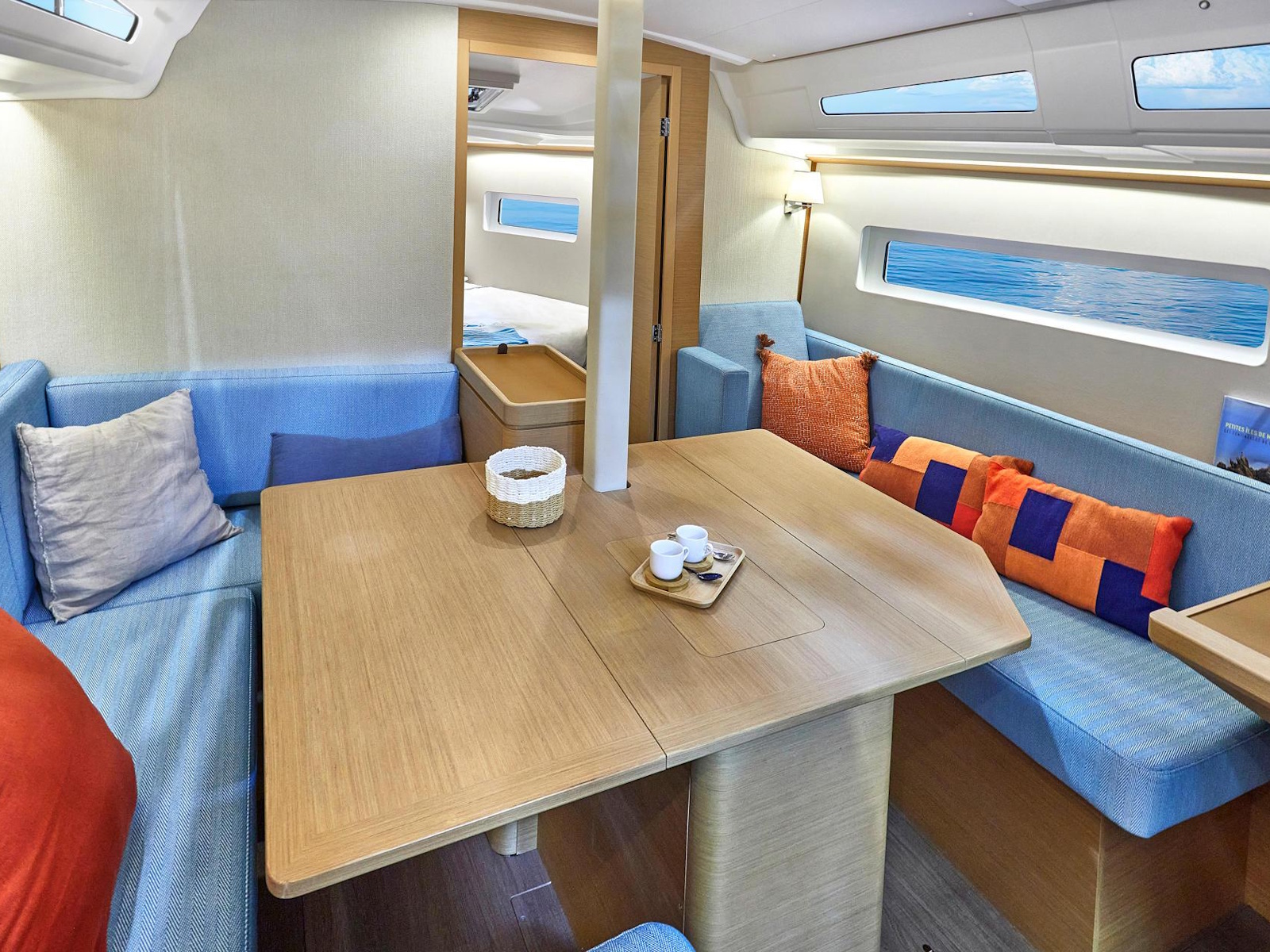 The bright, airy, interior space reveals a clean, contemporary aesthetic for a calm, comfortable atmosphere. Ingenuity and attention to detail are equally evident: a rectangular berth in the for-ward cabin, a daybed on the keel box for greater comfort while sailing on more agitated waters, and the possibility of having three spacious cabins or two, with two separate showers and a storage locker. With the Sun Odyssey 380, fluidity and serenity characterise life on board as much as cruising.