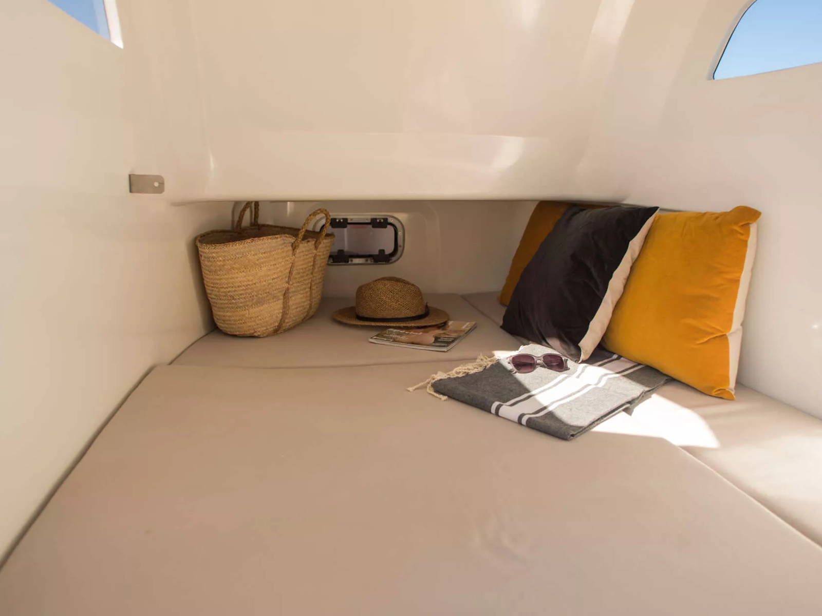 A spacious relaxation area for unforgettable days on the water. Double bow and rear U-Lounge, convertible to a sundeck area. Up to 14 seats in standard equipment, integrated kitchen with sink (optional : grill), console integrating a habitable cabin with toilets (optional : bunk bed space). Triple position bolster for up to two adults + one child. Rear bathing platforms giving access to the sea.